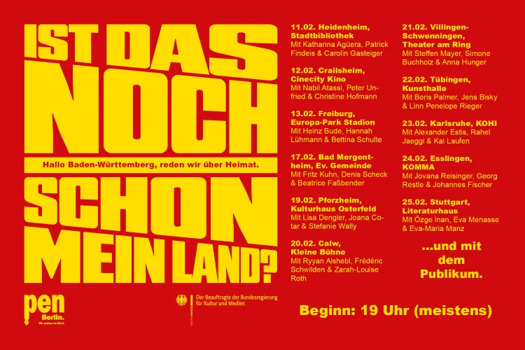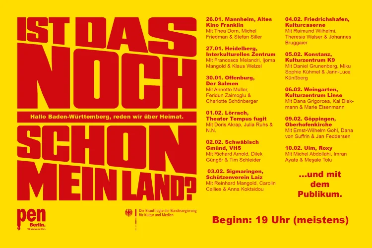The PEN Berlin writers’ association is heading to south-west Germany to host a series of talks in 22 towns and cities in Baden-Württemberg. This is the first in a series of events, with further talks planned for March in Rhineland-Palatinate, and in August and September in Saxony-Anhalt, Mecklenburg-Western Pomerania, and Berlin.