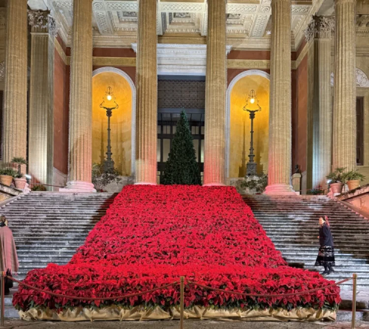 Vorbereitet auf die Schmerzensreiche wurde ich allerdings schon, als ich die so weite wie hohe Freitreppe des Teatro Massimo hinanstieg: eine mir geradezu entgegenfließende Lava aus Hunderten, wenn nicht Tausenden Weihnachtssternen – Pflanzen, die Inkarnation fast selber schon sind – Fleischwerdung, blutrot, empfindlich, verletzlich, und doch – und deshalb – Bethlehems Stern in der Blüte.